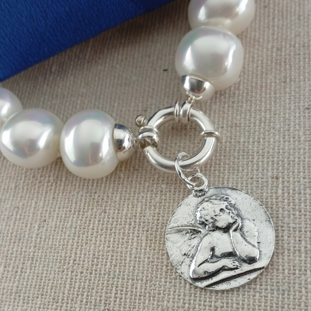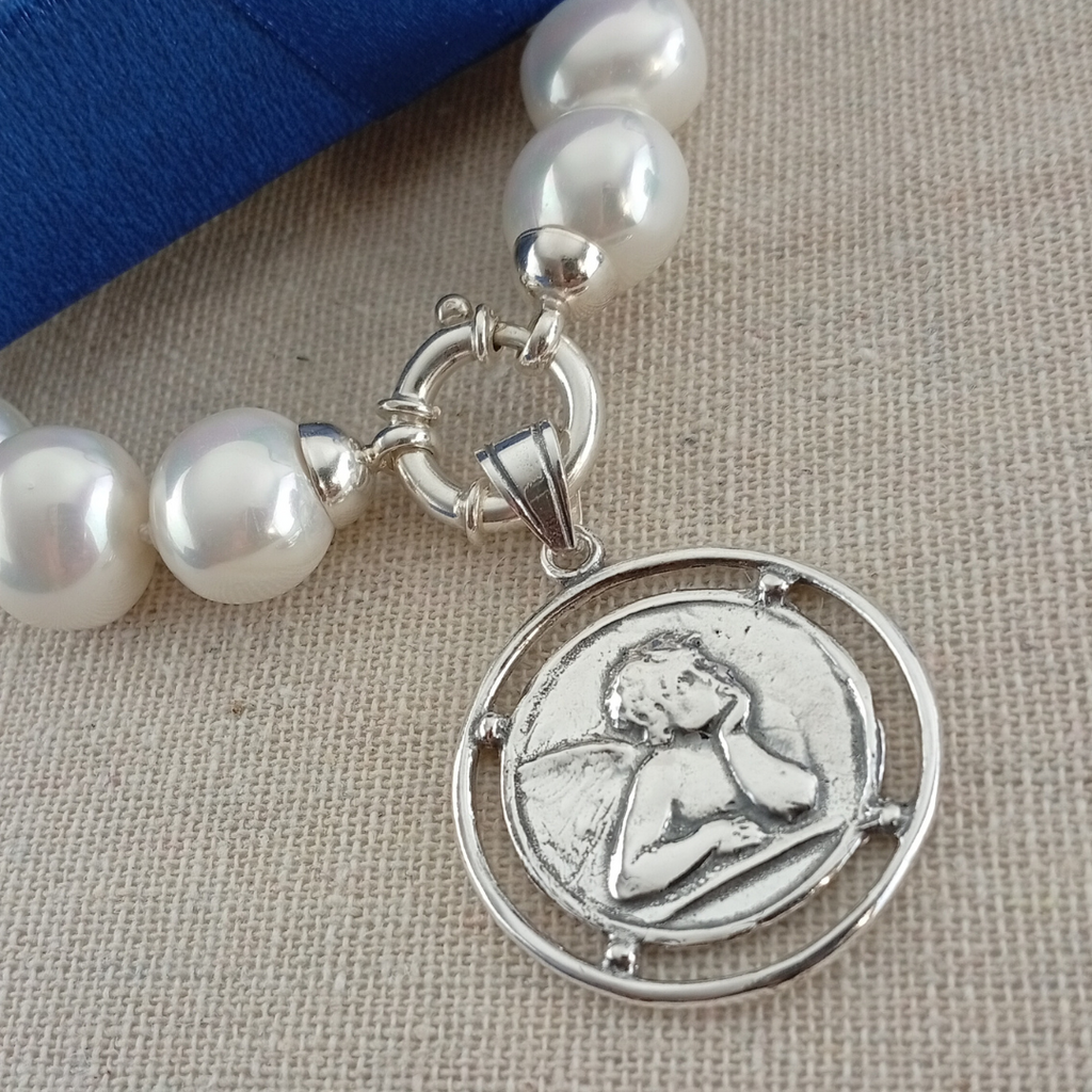 Collar Perlas Medianas Plata con Ángel Protector