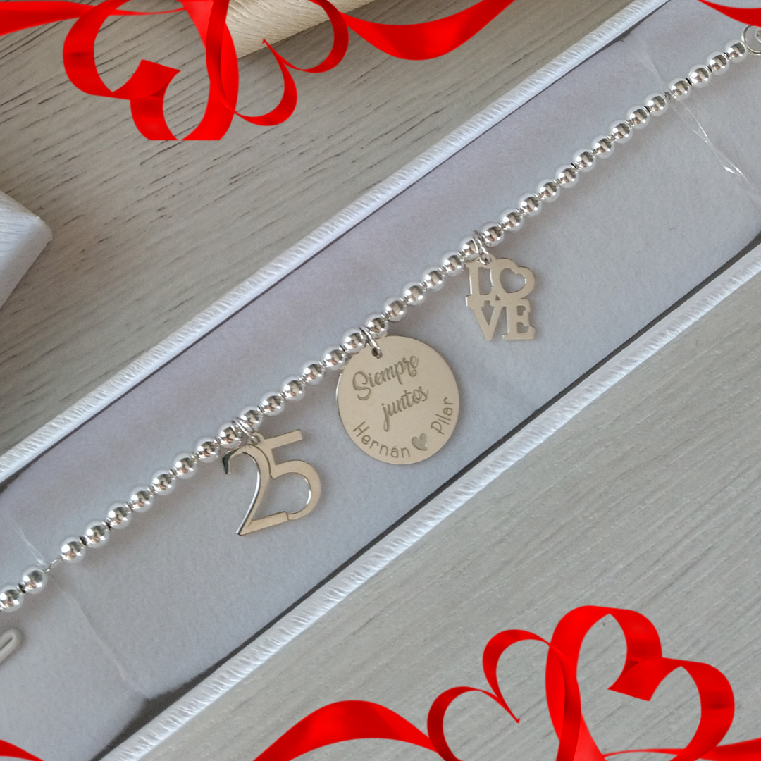 Pulsera en Plata de Ley, 925. Pulsera Aniversario o celebración de vuestro amor, tanto si llevas un año como si llevas 25 años con tu amor, se merece un regalo tan especial como este, por otros tantos años juntos, la pulsera es de bolas de 4 milímetros de larga entre 17 y 20,50 centímetros, con chapita Siempre juntos con vuestros nombres y otros dos colgantes love y el numero que tu quieras. (Aunque en la foto ponga 25 ponemos el numero que nos digas)